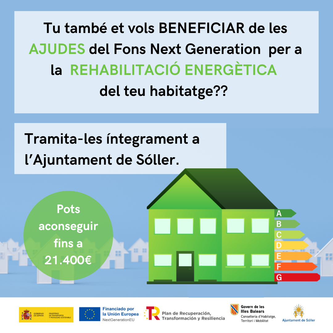 Si has fet o tens pensat fet una rehabilitació a casa teva, pots assolir una ajuda de fins 21.400 €, com li ha passat a un veí de Sóller que s’ha beneficiat d’una subvenció del Pla de Recuperació, Transformació i Resiliència (PRTR) Next Generation-EU per a la rehabilitació energètica del seu habitatge.