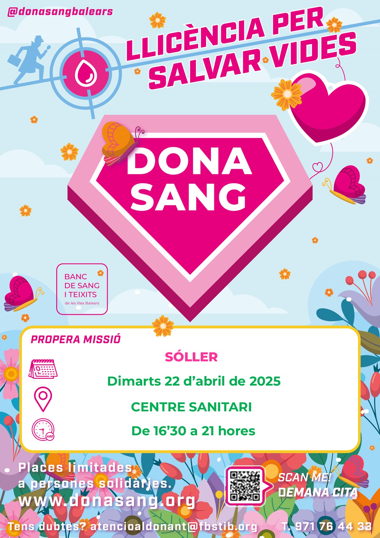 Demana cita per assegurar-te la teva plaça a donasang.org, al telèfon 971 76 44 33 o escaneja el QR.