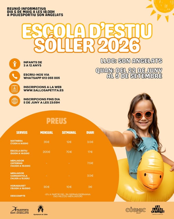 A partir d’avui obrim les inscripcions de l’escola d’estiu de Sóller, es farà al poliesportiu de Son Angelats per infants de 3 a 12 anys.