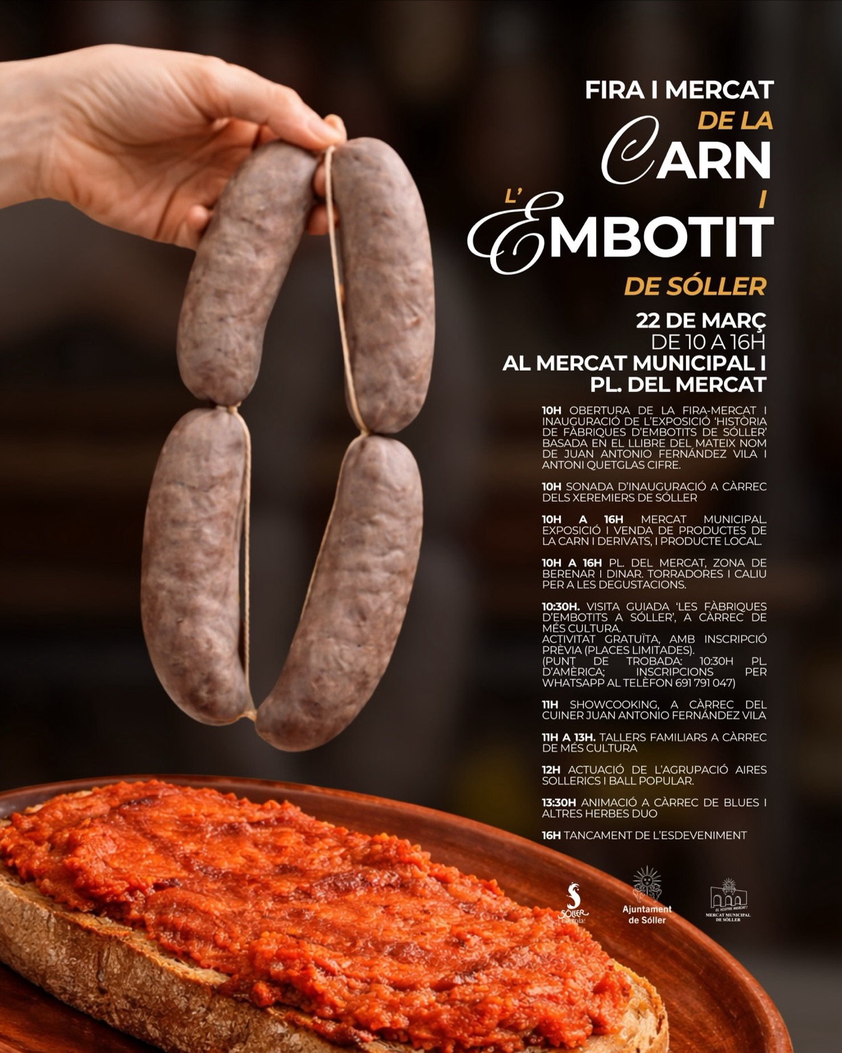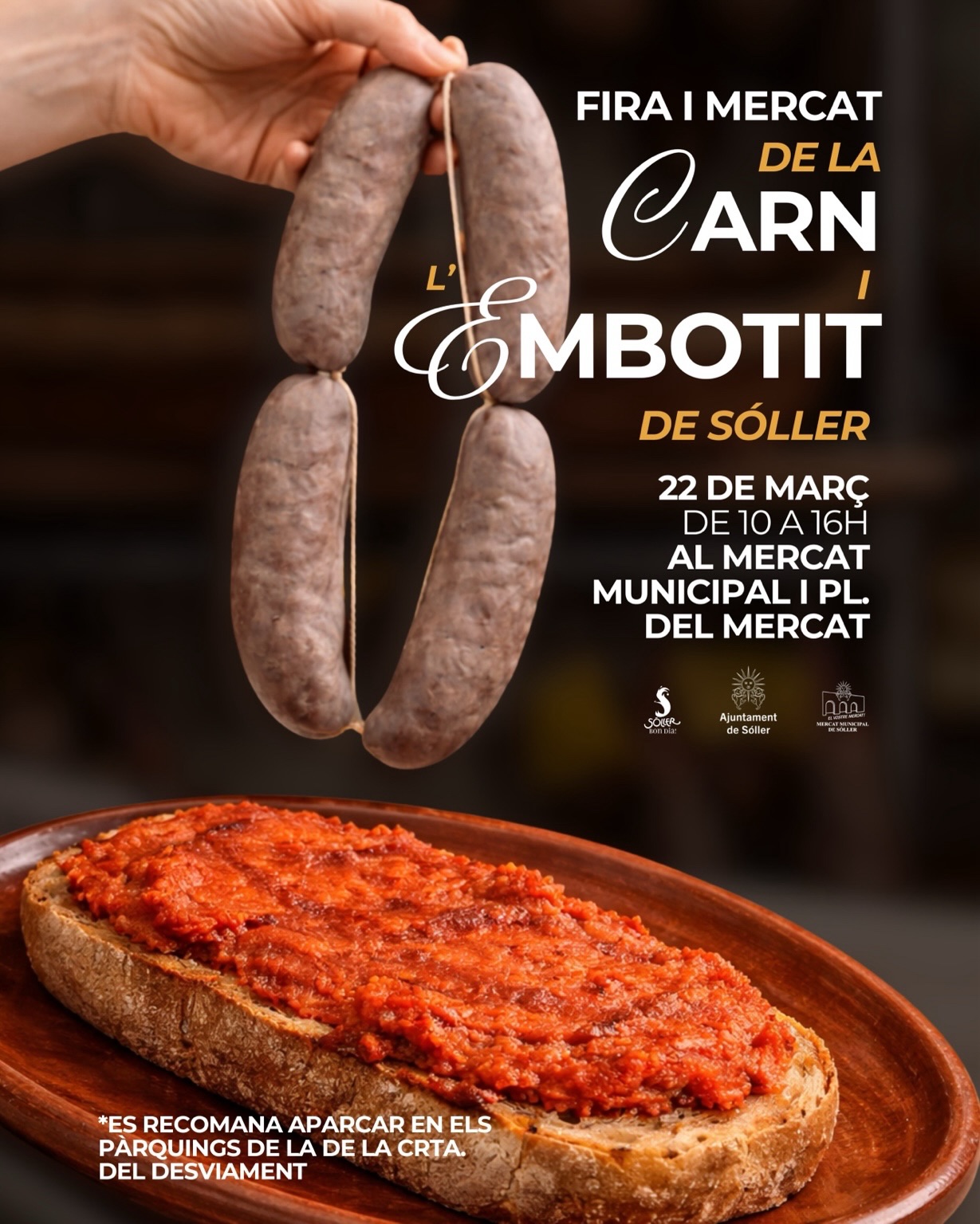 El pròxim 22 de març, el Mercat Municipal i la Plaça del Mercat acolliran una nova edició de la Fira i Mercat de la Carn i l’Embotit de Sóller, una jornada dedicada a posar en valor els nostres productes locals i la tradició gastronòmica del municipi.