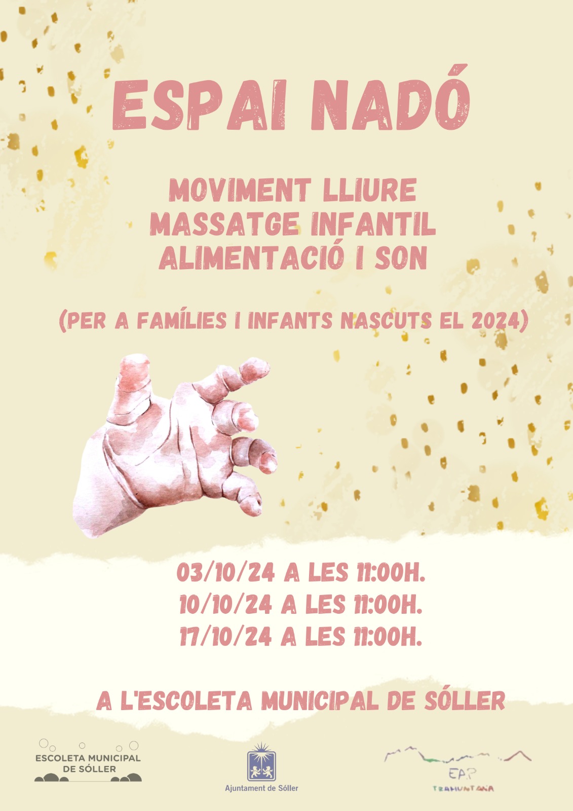 L’escoleta municipal de Sóller està preparant la jornada «Espai Nadó», destinada a infants nascuts l’any 2024 i les seves famílies amb el qual es donaran unes quantes pautes sobre el moviment lliure, el massatge infantil i l’alimentació i la son.