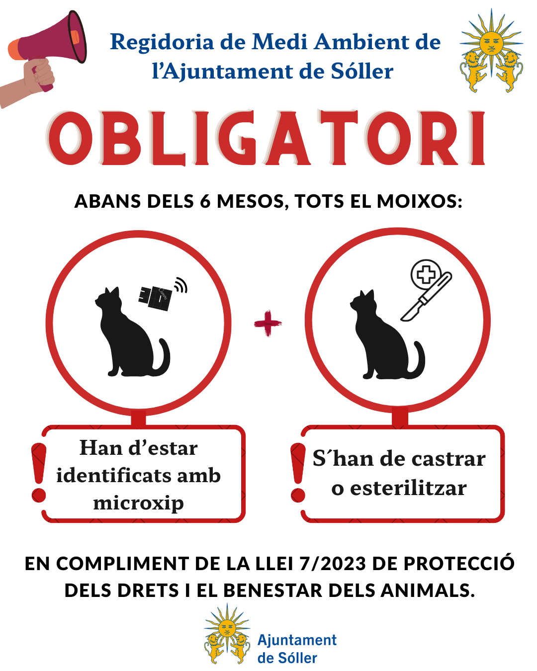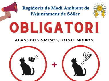 Des de la Regidoria de Medi Ambient de l’Ajuntament de Sóller recordam que, segons la Llei 7/2023 de protecció dels drets i el benestar dels animals, és obligatori identificar amb microxip i esterilitzar els moixos abans dels 6 mesos d’edat.