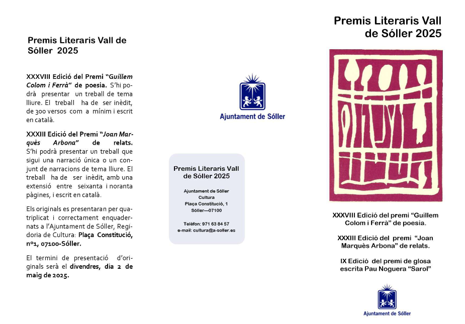 Comença la nova edició dels Premis Literaris Vall de Sóller 2025, en la XXXVIII Edició del Premi «Guillem Colom i Ferrà» de poesia, i la XXXIII Edició del Premi «Joan Marquès Arbona» de relats.