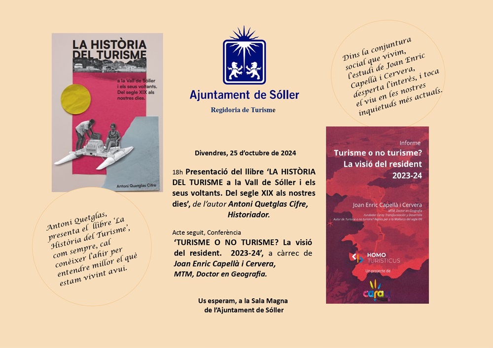 Divendres, 25 d’octubre, a les 18.00 h, esteu tots convidats a la presentació del llibre «La Història del Turisme a la Vall de Sóller i els seus voltants», de l’historiador Antoni Quetglas Cifre, que tindrà lloc a la Sala Magna de l’Ajuntament.