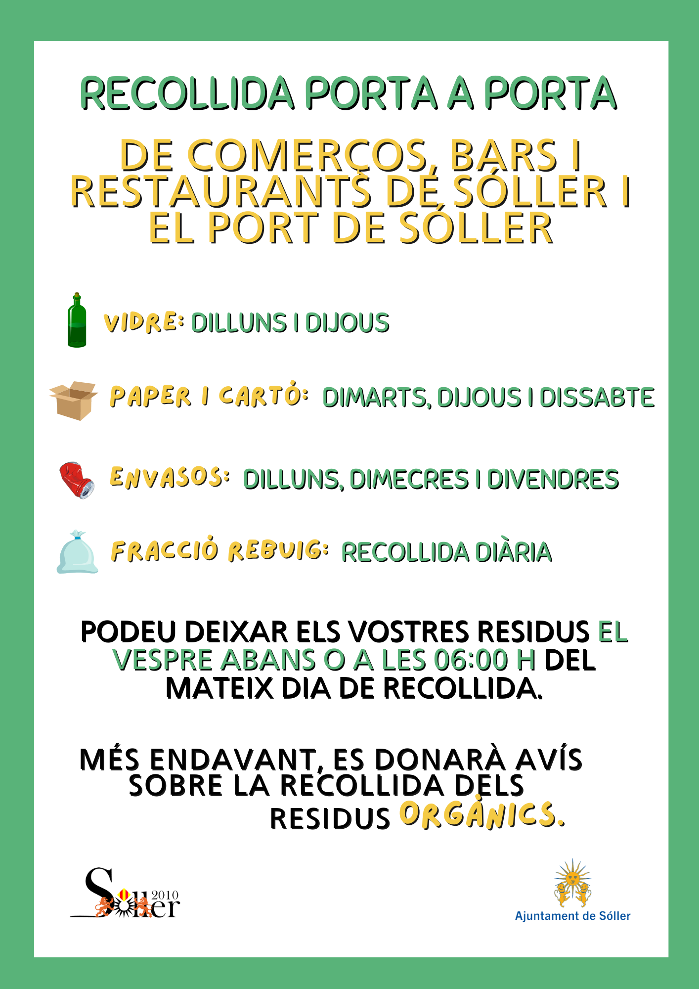 La Regidoria de Medi Ambient, a través de l’empresa Sóller 2010, ha posat en marxa el servei de recollida porta a porta per als comerços, bars i restaurants de Sóller i el Port de Sóller.