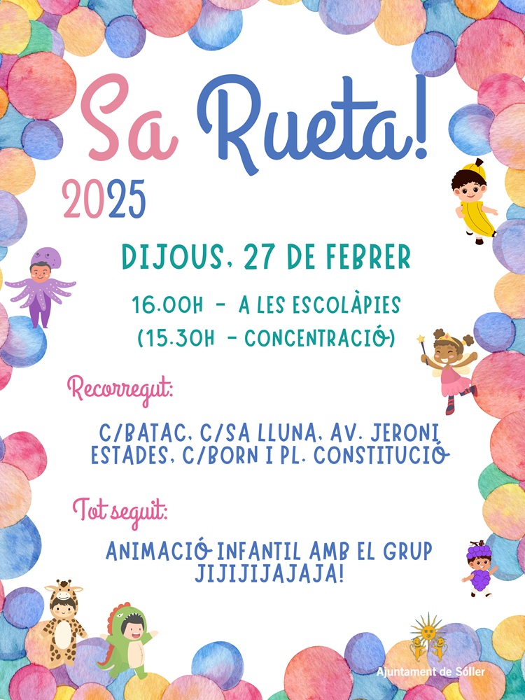 El pròxim dijous, 27 de febrer, els més petits seran els protagonistes de Sa Rueta 2025, una tarda plena de color, música i diversió!