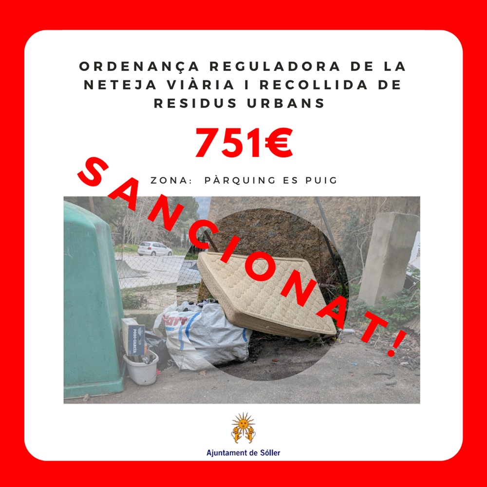 S’ha imposat una multa de 751 € per deixar residus voluminosos a la via pública, en aquest cas a la zona del Pàrquing de Es Puig. Recordem que abandonar matalassos, mobles o electrodomèstics al carrer no només embruta el nostre entorn, sinó que també comporta sancions.