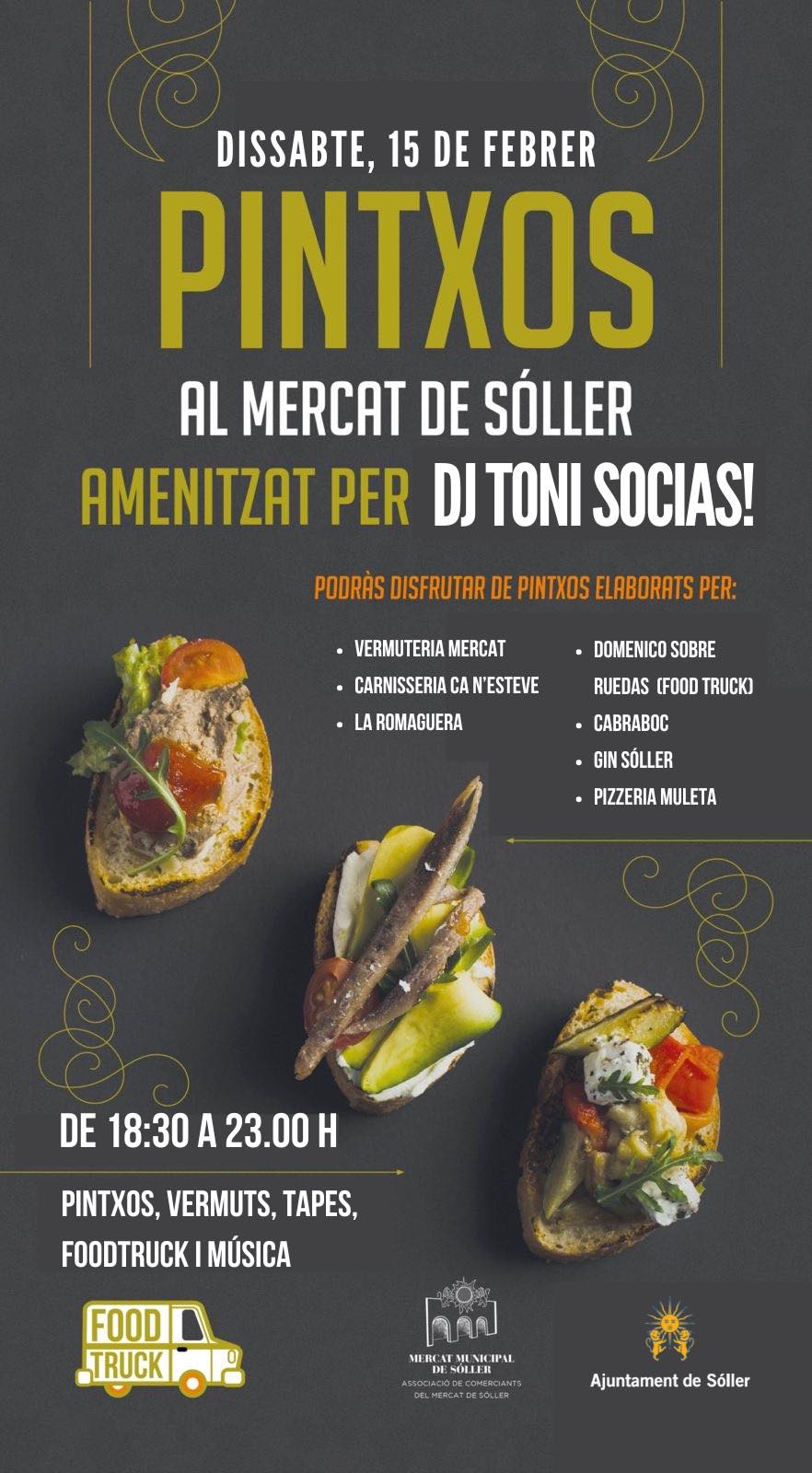 Aquest dissabte, 15 de febrer, el Mercat de Sóller acollirà una nova edició del Tast de Pintxos, una cita imprescindible per als amants de la gastronomia i la bona música!