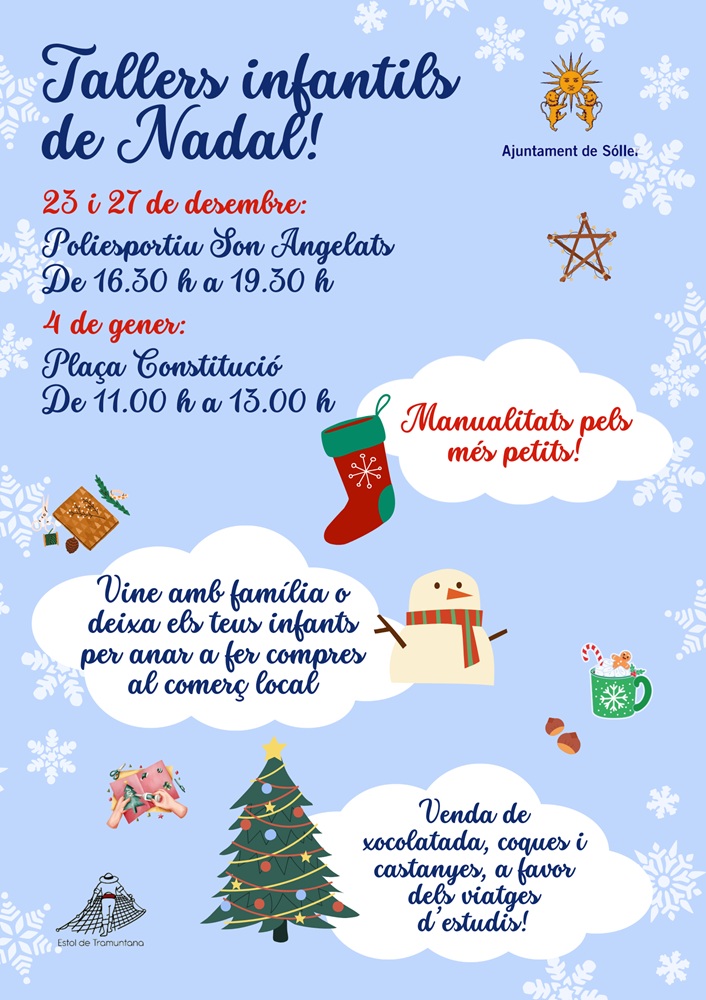 Els pròxims 23 i 27 de desembre i el 4 de gener, us convidam a passar una jornada plena de màgia i fantasia amb els tallers infantils nadalencs que la Regidoria de Festes ha organitzat especialment per als més petits de casa. Seran uns dies plens de creativitat, manualitats i moltes rialles!