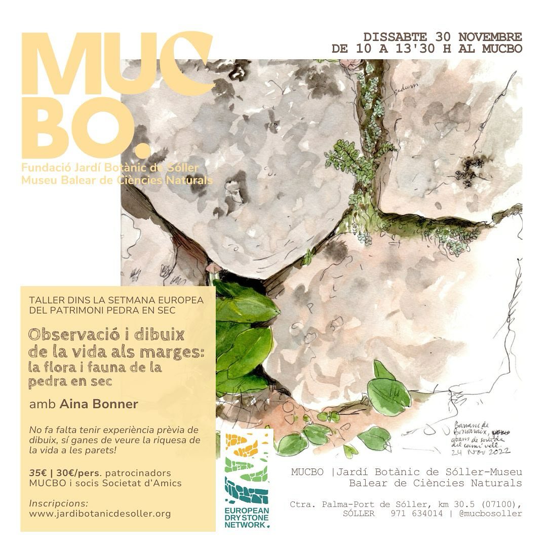 Dins la setmana de la pedra en sec, al MUCBO organitzam una taller amb la il·lustradora i divulgadora científica Aina Bonner. “Observació i dibuix de la vida als marges: la flora i fauna de la pedra en sec” és una proposta per practicar l’observació als marges del jardí, i després centrar-se en dibuixar una selecció de flora i fauna que hi trobarem. Benvinguts dibuixants tant experimentats com novells, no fa falta tenir experiència prèvia de dibuix!